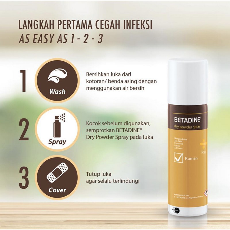 Why Betadine First Aid Basics. This medicine is available as a spray that is applied to the affected areas of the skin. Betadine dry powder spray 55gm 10 PVPI Antiseptic Solution For treatment of skin infections. For prevention of infections in wounds burns cuts scratches and abrasions with germicidal effects. Betadine Dry Powder Antiseptic Spray is a quick acting easy to use disinfectant spray ideal for sterilising minor cuts wounds scrapes and even burns. Betadine Antiseptic Dry Powder Spray. Containing powerful but gentle agents Betadine Dry Powder Antiseptic Spray is a low mess wound treatment that. Betadine products do not contain alcohol or hydrogen peroxide which can sting when applied. It remains a go-to antiseptic used both in hospitals and homes for the treatment of minor cuts scrapes and burns as may occur from minor household accidents or bicycle falls.