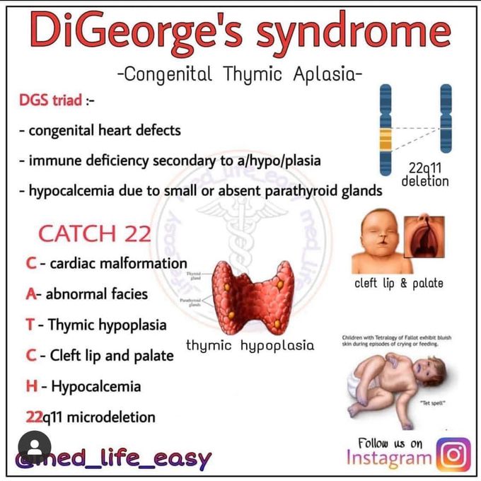 A mnemonic to remember the manifestations of 22q112 deletion syndrome DiGeorge syndrome is. Part of CATCH 22 DiGeorge syndrome DGS comprises thymic hypoplasia hypocalcaemia outflow tract defects of the heart and dysmorphic facies.