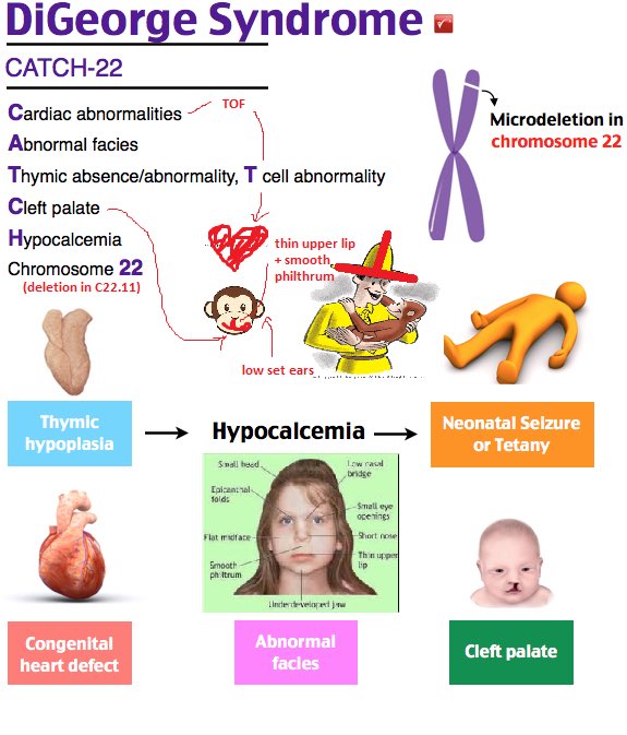 Cardiac - aortic arch anomalies conotruncal TOF truncus arterious interrupted aorta tricuspid atresia Abnormal facies - hypertelorism ear anomalies short down slanting palpebral fissures antimongoloid short philtrum. DiGeorge syndrome also known as 22q112 deletion syndrome is a syndrome caused by the deletion of a small segment of chromosome 22. 9 The underlying disorder is microdeletion in the 22q112 region of the 22nd chromosome but the pathophysiology is not fully understood. CATCH 22 mnemonic for DiGeorgesyndrome. It results in almost all cases from a deletion within chromo-some22qll. The estimated incidence of DiGeorge syndrome is approximately 1 in 40006000 live births. Main problem is related to the immune system due to aplasia of the thymus T cells are unable to mature.