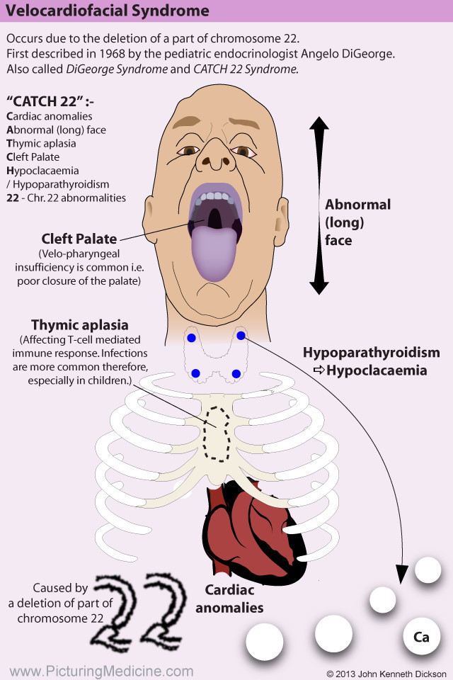 We report the clinical findings in 44 cases. DiGeorge syndrome is sometimes described as one of the CATCH 22 disorders so named because of their characteristicscardiac defects abnormal facial features thymus underdevelopment cleft palate and hypocalcemiacaused by a deletion of several genes in chromosome 22. Abnormal facies hypertelorism low set ears short philtrum among others T. CATCH 22 syndrome 22q112 deletion syndrome also called DiGeorge syndrome and velocardiofacial syndrome is a disorder caused by the deletion of a small piece of chromosome 22. Part ofCATCH22 DI Wilson J Burn PScambler J Goodship Abstract DiGeorge syndrome DGS comprises thymic hypoplasia hypocalcaemia out-flow tract defects ofthe heart and dys-morphic facies. DiGeorge syndrome also known as 22q112 deletion syndrome is a syndrome caused by the deletion of a small segment of chromosome 22. We propose that DiGeorge syndrome should be seen as the severe end of the clinical spectrum embraced by the acronym CATCH 22 syndrome. We report the clinical findings in 44 cases. We propose that DiGeorge syndrome should be seen as the severe end of the clinical spectrum embraced by the acronym CATCH 22 syndrome.