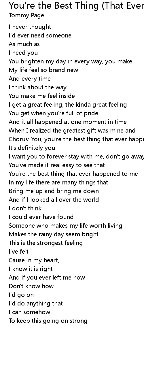 You're the best thing that ever happened to me lyrics. Best Thing That Ever Happened To Me Lyrics. Ive had my share of lifes ups and downs But fates been kind the downs have been few I guess you could say that Ive been lucky Well I guess. Cause youre the best thing that ever happened to me Ah youre the best thing that ever happened to me Oh there have been times when times were hard But always somehow I made it I made it through Cause for every moment that Ive spent hurting There was a moment that Ive spent ah just loving you yeah If anyone should ever write my life story.