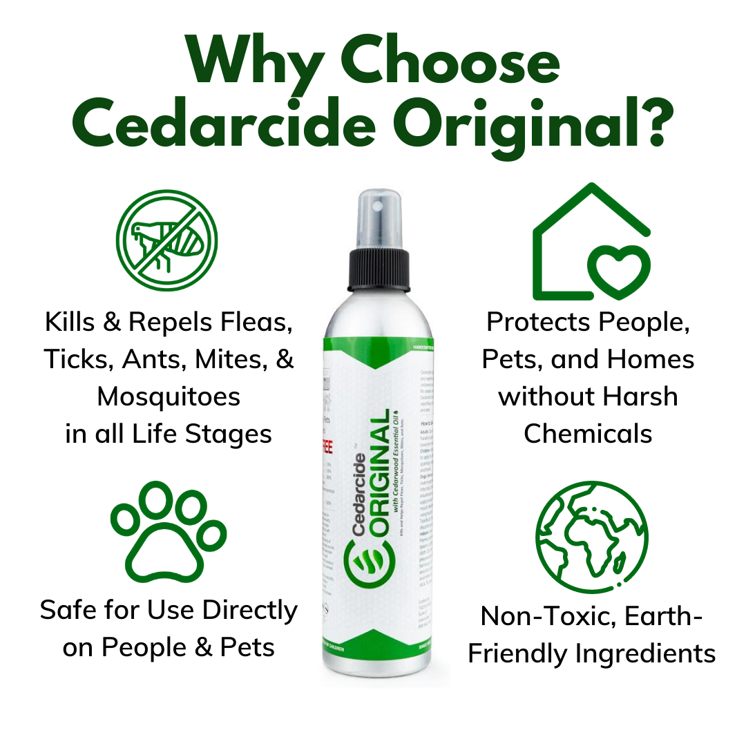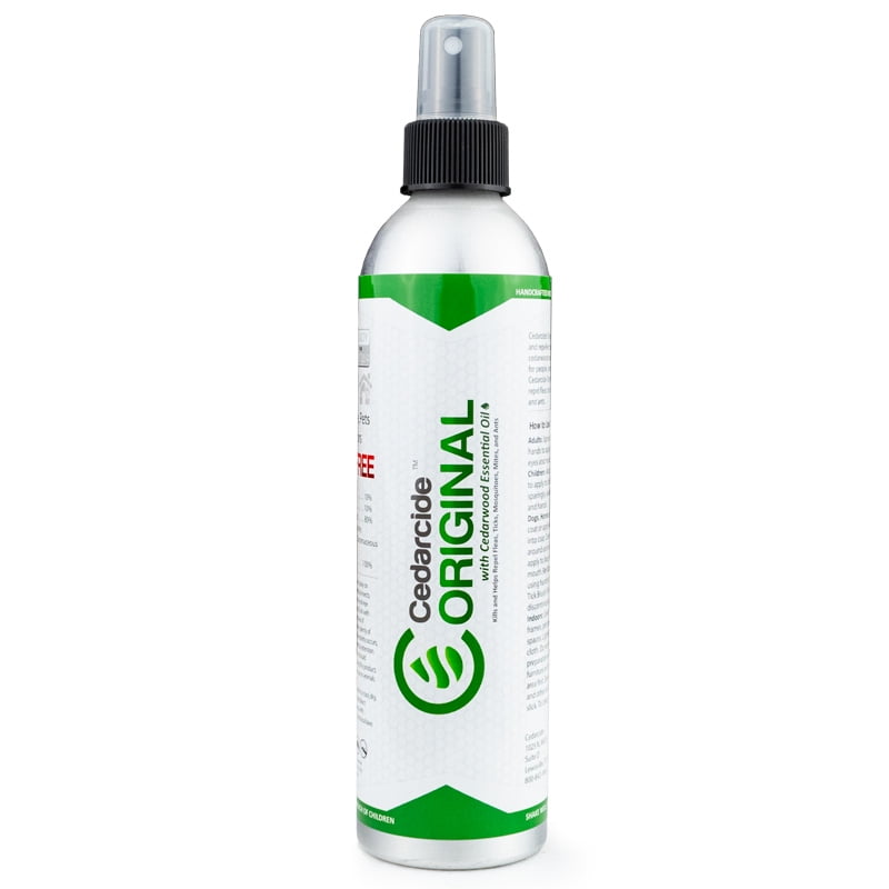 Cedarcide Original is a family-safe plant-based bug spray for use on people pets and all throughout your home. Our CEDAR-AL cedar oil leaves no oily residue on fabrics or furniture and is safe to use on your skin on your pets and most fabrics. Cedar oil spray drives away insects such as mosquitoes and other bothersome crawling or flying insects around the house.