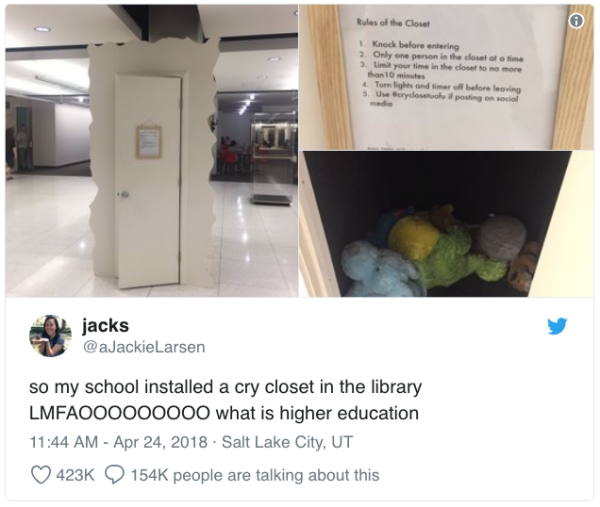 Make CRY CLOSET memes or upload your own images to make custom memes. HttpbitlyNeatMemeDiscount Extra 5 Order Over 49 Code. The university of Utah have installed a Cry Closet for stressed out students to use.